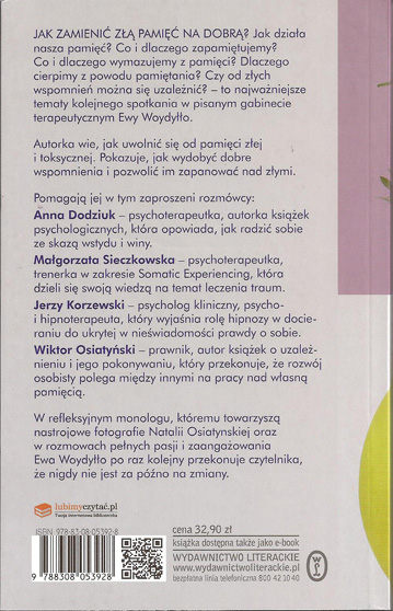 Nowa książka wybitnej psycholog. O pamięci. I sztuce zapominania. Jak działa nasza pamięć? Dlaczego jedne zdarzenia doskonale zapamiętujemy, a inne wymazujemy z pamięci? Jak ćwiczyć pamięć? I w końcu: czy niezawodna pamięć, o której często marzymy i której często pragniemy, rzeczywiście jest nam tak bardzo potrzebna? Najnowsza książka Ewy Woydyłło to pod wieloma względami rewolucja w myśleniu o pamięci. Znana psycholog pisze bowiem nie tylko o tym, jak dbać o swą pamięć, ale przede wszystkim o tym, jak ćwiczyć się w zapominaniu. Pamięć może przecież być źródłem cierpień, może posiadać toksyczną moc, z którą trzeba umieć walczyć. Ta książka dla wielu osób może stać się orężem w tej trudnej walce. Ewa Woydyłło zaprasza czytelników do swego gabinetu terapeutycznego i doradza, jak uwolnić się od pamięci złej. Pokazuje, jak wydobyć dobre wspomnienia i pozwolić im zapanować nad złymi, które często nas zniewalają.