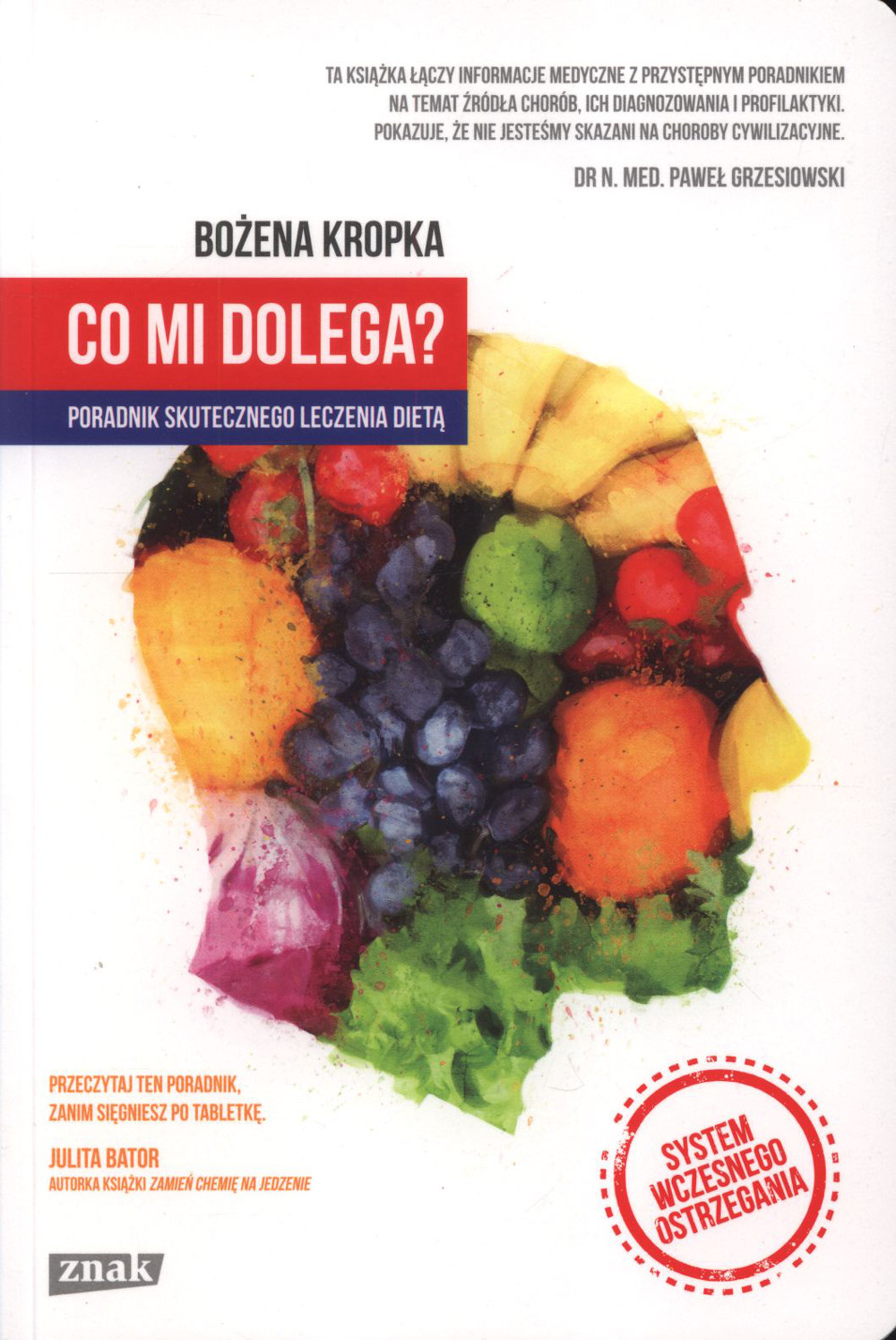 Zaczęło się od choroby córki. Na mocną wysypkę nie pomagały leki. Lekarze bezradnie rozkładali ręce i mówili, że to „taka uroda”. Bożena Kropka - ceniona specjalistka od spraw leczenia żywieniem wzięła sprawy w swoje ręce. Teraz do jej gabinetu przyjeżdżają setki chorych z całej Polski. Nikt nie jest skazany na choroby cywilizacyjne. Jeśli dokuczają Ci bóle głowy, zmęczenie, problemy skórne, drażliwość, problemy z trawieniem, ta książka jest dla ciebie! Dzięki niej nauczysz się interpretować pierwsze niepokojące symptomy i dowiesz się, o jakie badania poprosić w gabinecie lekarskim. Autorka patrzy na pacjenta całościowo. Wyjaśnia, że 80% chorób wynika ze złej diety. Wskazuje, dlaczego jelita mają wpływ na nasz nastrój oraz jakie są źródła alergii i nietolerancji pokarmowych. Czy to możliwe, że zwykły jogurt owocowy może mieć związek z przewlekłym zapaleniem zatok? Co mi dolega? Poradnik skutecznego leczenia dietą przedstawia praktyczny system wczesnego ostrzegania i skuteczny program zdrowego życia. Bożena Kropka wskazuje, jak dieta w decydujący sposób wpływa na nasze zdrowie. Jakie pokarmy łagodzą lub leczą, np. anemię, choroby wątroby, czy tarczycy. Jej praktyczny jadłospis to coś więcej niż łatwe wskazówki - to przepis na zdrowie. Joanna Gruszka - dietetyk kliniczny