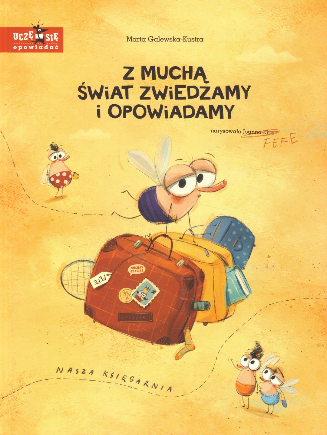 Nauka wcale nie musi być nudna. Do świetnej zabawy wystarczy książka pełna przygód i kolorowych ilustracji, a to wszystko znajdziecie w "Z muchą zwiedzamy i opowiadamy". Szukasz ciekawej książki, która pomoże Twojemu maluchowi w rozwoju wyobraźni i kreatywności? Jeśli tak, to publikacja "Z muchą świat zwiedzamy i opowiadamy" jest właśnie dla Was. Autorką tej wspaniałej książeczki jest Marta Galewska-Kustra. Lektura ta pomoże maluchowi przede wszystkim w prawidłowym rozwoju mowy. Sprawi, że Twoje dziecko nauczy się niezwykle trudnej sztuki jaką jest opowiadanie. Autorka w pomysłowy sposób połączyła naukę z zabawą. Z pewnością nikogo nie znudzą niezwykłe przygody zabawnej muszki Fefe. Dodatkowym atutem książeczki są kolorowe ilustracje Joanny Kłos. "Z muchą świat zwiedzamy i opowiadamy" to jedna z książek z serii "Uczę się mówić, wymawiać, opowiadać". Poznasz w niej wakacyjną przygodę głównej bohaterki - muchy Fefe. Tym razem wyruszy ona w daleką podróż do Hiszpanii, a trafi tam przez przypadek, zasypiając w walizce. Przekonasz się jak postrzegany jest świat przez małą muszkę. Będzie się jej wydawać, że np.: lotnisko to lunapark, a ludzie leżący na plaży w okularach oczekują na film 3D. Oprócz tego razem z nią popływasz w morzu i nauczysz się tańców latynoskich. W trakcie czytania Twoje dziecko będzie miało możliwość udzielenia odpowiedzi na pytania, które autorka umieściła w książce. W ten sposób nauczy się ono opowiadania. Kto wie może w ciekawy sposób rozwinie historię niesfornej muszki? "Z muchą świat zwiedzamy i opowiadamy" to jedna z propozycji dla Ciebie i Twojego malucha. Inną książką tej samej autorki jest "Z muchą na luzie ćwiczymy buzię". Jest to publikacja pełna wskazówek i ciekawych pomysłów na ćwiczenie mowy. Znajdziesz tam, m.in. takie przykłady, jak: liczenie zębów językiem, ziewanie, naśladowanie sygnałów dźwiękowych. "Uczę się mówić, wymawiać, opowiadać" to seria, która może okazać się niezbędna w niejednym domu. Jest to skuteczny i szybki sposób na pomoc w prawidłowym rozwoju dziecka. Przekonajcie się sami!