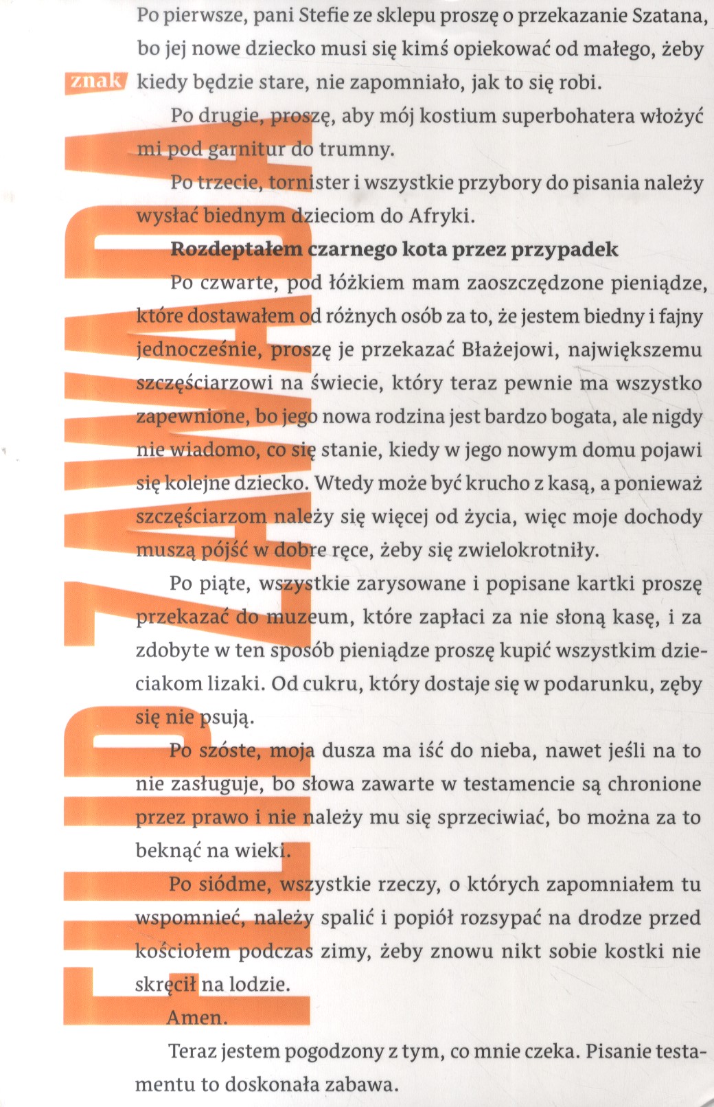 O ludziach, którzy mają dużo miłości, ale nie mają komu jej dać Na świecie pewnych jest tylko kilka rzeczy. Za wyrażanie się nie dostajesz deseru (kto by go zresztą jadł). Błażej to beksa i irytujący dureń, który gówno wie o życiu. A dorośli zajmują się samymi pierdołami, no chyba, że są kierowcami cystern. I bądź tu mądry, kiedy kot Szatan znika w tajemniczych okolicznościach, sklepikarka Stefa rodzi sobie nagle dziecko, a za zakonnicami to już w ogóle nie trafisz. Rozdeptałem czarnego kota… to historia poszukiwania swojego miejsca na Ziemi, planecie ludzi. Świeża, błyskotliwa proza, która sprawia, że zaczynasz widzieć, jak bardzo świat z twoich wyobrażeń różni się od tego, w którym żyjesz. Z każdą stroną uświadamiasz sobie, że tę książkę Filip Zawada napisał właśnie o tobie. Wszyscy mówią, że jestem znajdą, chociaż jeżeli nigdy nikt nikogo nie zgubił, to ciężko powiedzieć, że ktoś kogoś znalazł. [fragment książki]