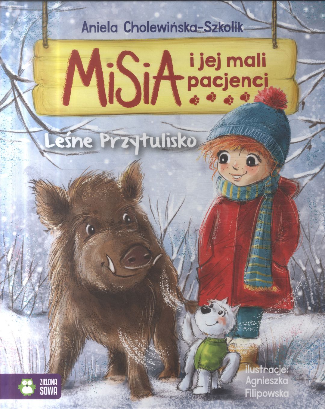 Misia spędza ferie zimowe w leśniczówce wujka Piotra, który prowadzi schronisko dla dzikich zwierząt. Misia wraz z kuzynem Jankiem chętnie pomagają w opiece nad mieszkańcami Leśnego Przytuliska. Podczas gdy dziewczynka i Popik powoli zdobywają zaufanie i przyjaźń dziwnie markotnego dzika, do leśnej zagrody trafia ranny łoś, a w pobliżu coraz częściej przesiaduje pewna sowa. Misia i Popik jak zwykle zrobią wszystko, żeby pomóc zwierzętom. [Nota wydawcy].