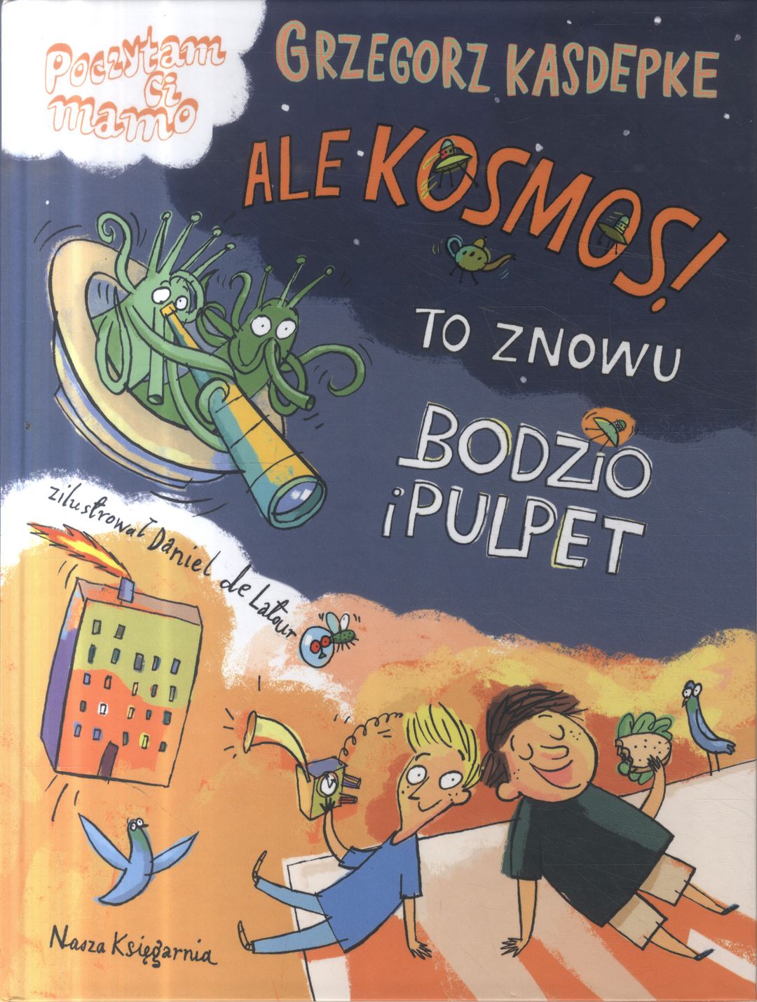 Kosmici są wszędzie… Na szczęście czujni Bodzio i Pulpet rozpoczęli przygotowania! Nie do końca odpowiada to może ich nauczycielom, ale kto by się tym przejmował. Jest tyle spraw do załatwienia. Na przykład trzeba przećwiczyć loty w kapsule kosmicznej, nauczyć się łapać kosmostop, wynaleźć urządzenie do wykrywania złych emocji czy przerobić mikrofalówkę na portal kosmiczny… Jeśli lubicie się śmiać, przeczytajcie tę książkę. Ona jest po prostu fantastyczna!