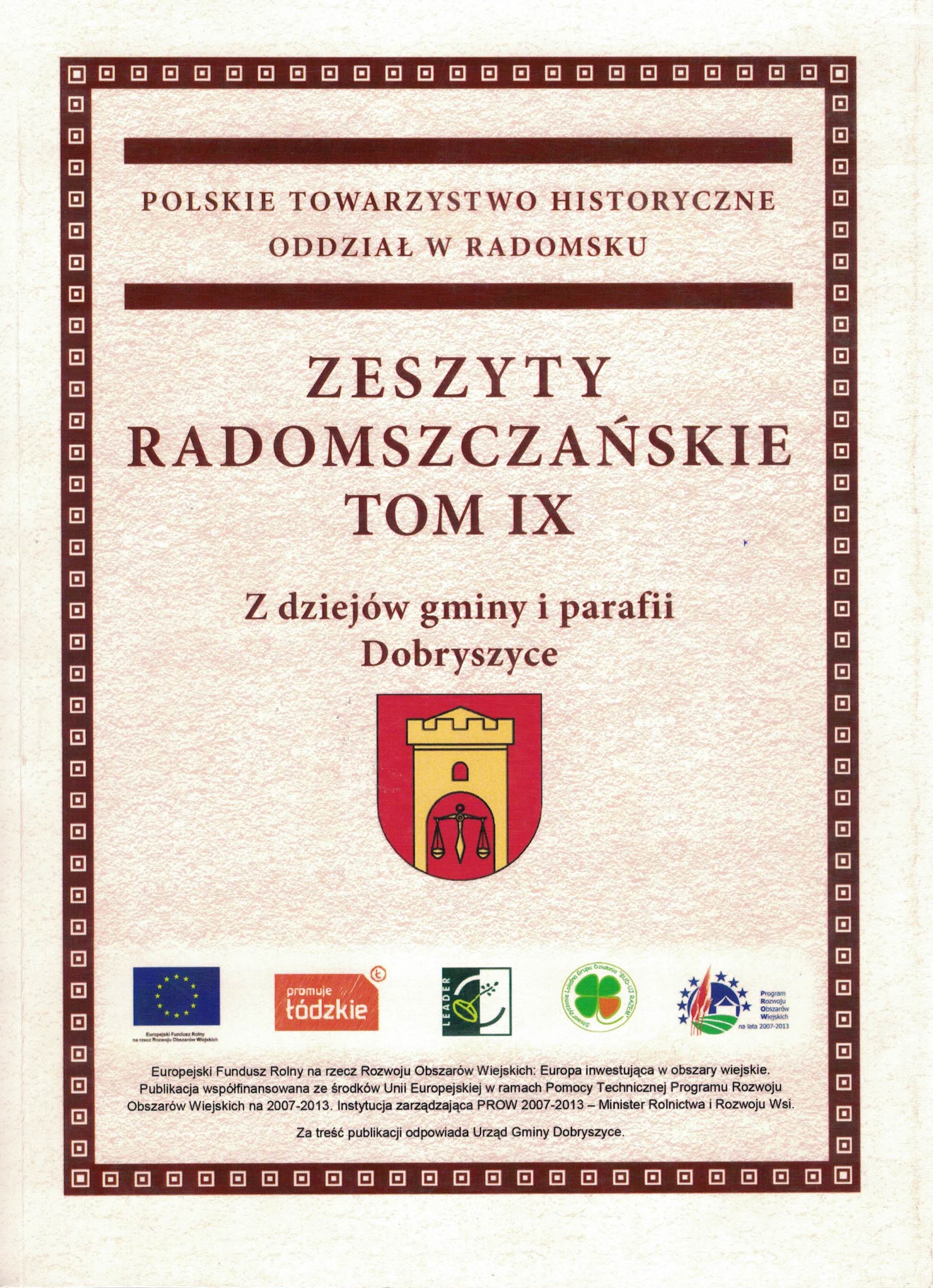 Zawiera: Pradzieje ziemi dobryszyckiej / Krzysztof Błaszczyk, Piotr Zawilski ; Późnośredniowieczny sąd grodzki w Dobryszycach / Michał Pawlikowski ; Zarys osadnictwa w gminie Dobryszyce / Jan Pawlikowski ; Społeczność parafii Dobryszyce (XVI-poł. XVIII w.) / Tomasz Andrzej Nowak ; Produkcja rolnicza w Dobryszycach na podstawie lustracji dóbr królewskich (XVI-XVIII w.) / Jan Pawlikowski ; / Parafia Dobryszyce w okresie niewoli narodowej (1772-1918) /Jan Związek ; Duchowieństwo parafii Dobryszyce / Jacek Kapuściński ; Dzieje młynarstwa w Dobryszycach i okolicy (do 1945 r.) / Tomasz Kuźnicki ; Jednoroczna Szkoła Rolnicza w Dobryszycach (1919-1939) / Jan Pawlikowski ; Wspomnienia o Dobryszycach / Karolina Pawlikowska ; Cenne zabytki z Dobryszyc w Muzeum Narodowym w Krakowie / Jan Pawlikowski ; Nie tylko pracą żyli mieszkańcy Dobryszyc / Elżbieta Matras Adamusowa ; Postanowienie o umorzeniu śledztwa w sprawie zbrodni popełnionych przez Hitlerowskich żandarmó w latach 1940-1943 na terenie Dobryszyc i okolicznych miejscowości / Agnieszka Podolska