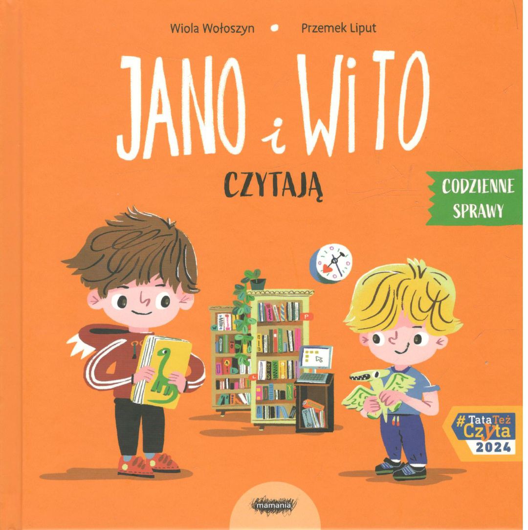 Jano i Wito czytają / [tekst:] Wiola Wołoszyn , [ilustracje:] Przemek Liput. - Warszawa : Mamania, copyright 2024. - [22] strony : ilustracje ; 20x20 cm.