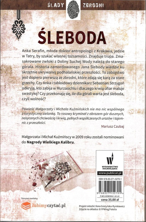 Intrygująca opowieść o grozie narastającej w spokojnej podhalańskiej wsi, o murze milczenia wokół wojennych losów, o ciemnych interesach miejscowych biznesmenów i polityków, o obiecanej przed laty zemście. Anka Serafin przyjeżdża w góry w poszukiwaniu własnej tożsamości. Znajduje trupa. Zmasakrowane zwłoki z Doliny Suchej Wody okazują się należeć do starego górala. Jego historia sięga najskrzętniej skrywanych zakamarków góralskiej przeszłości, z której nikt nie mógł wyjść czysty. A jego śmierć to dopiero początek morderstw, które układają się w makabryczną wróżbę. Czy Anka - antropolożka kultury z Krakowa, która chciałaby być góralką - i tabloidowy dziennikarz śledczy Sebastian Strzygoń, rozwikłają zagadkę, kto zabija w Murzasichlu i dlaczego krwią ofiar namalowano swastykę?